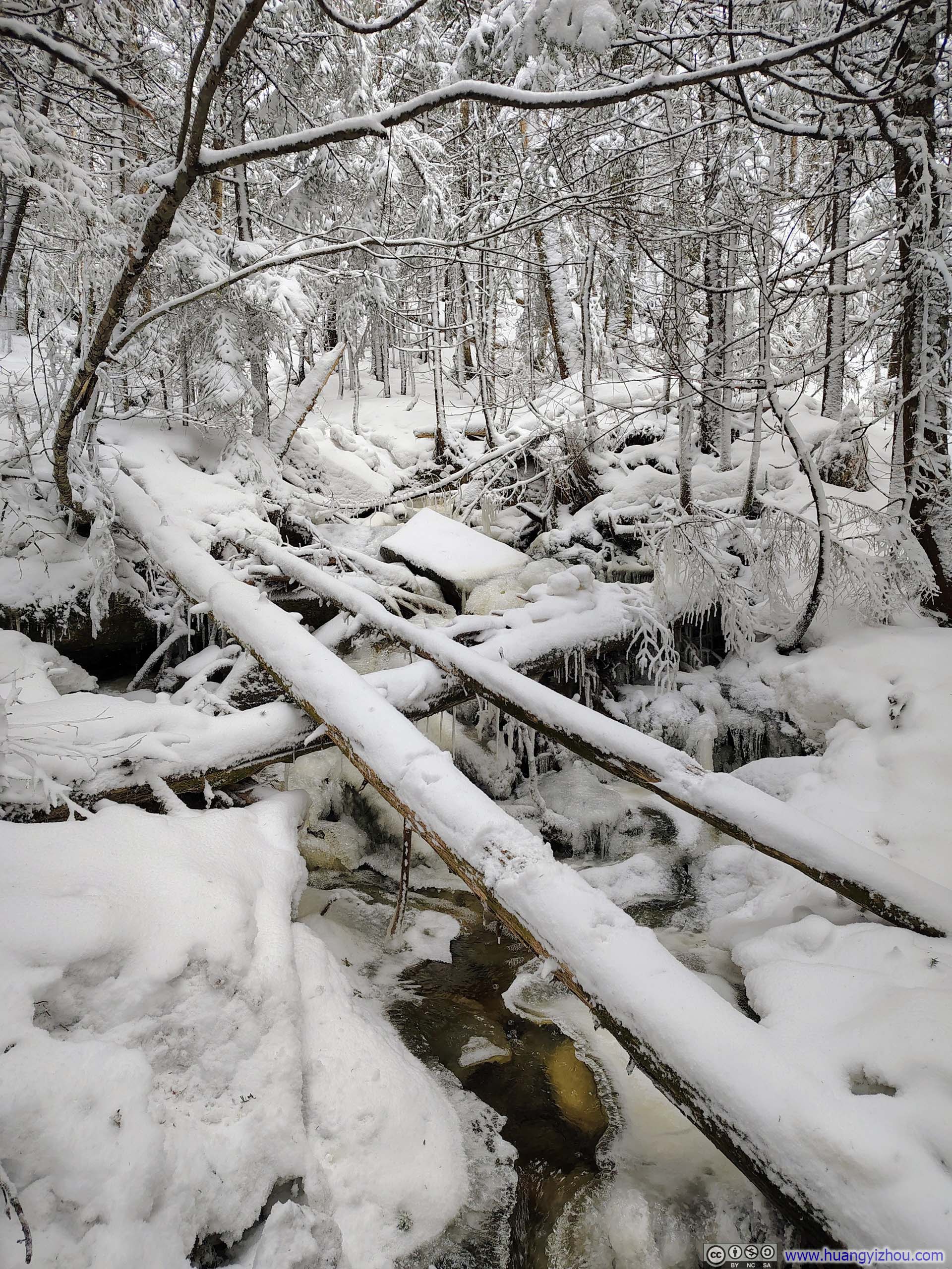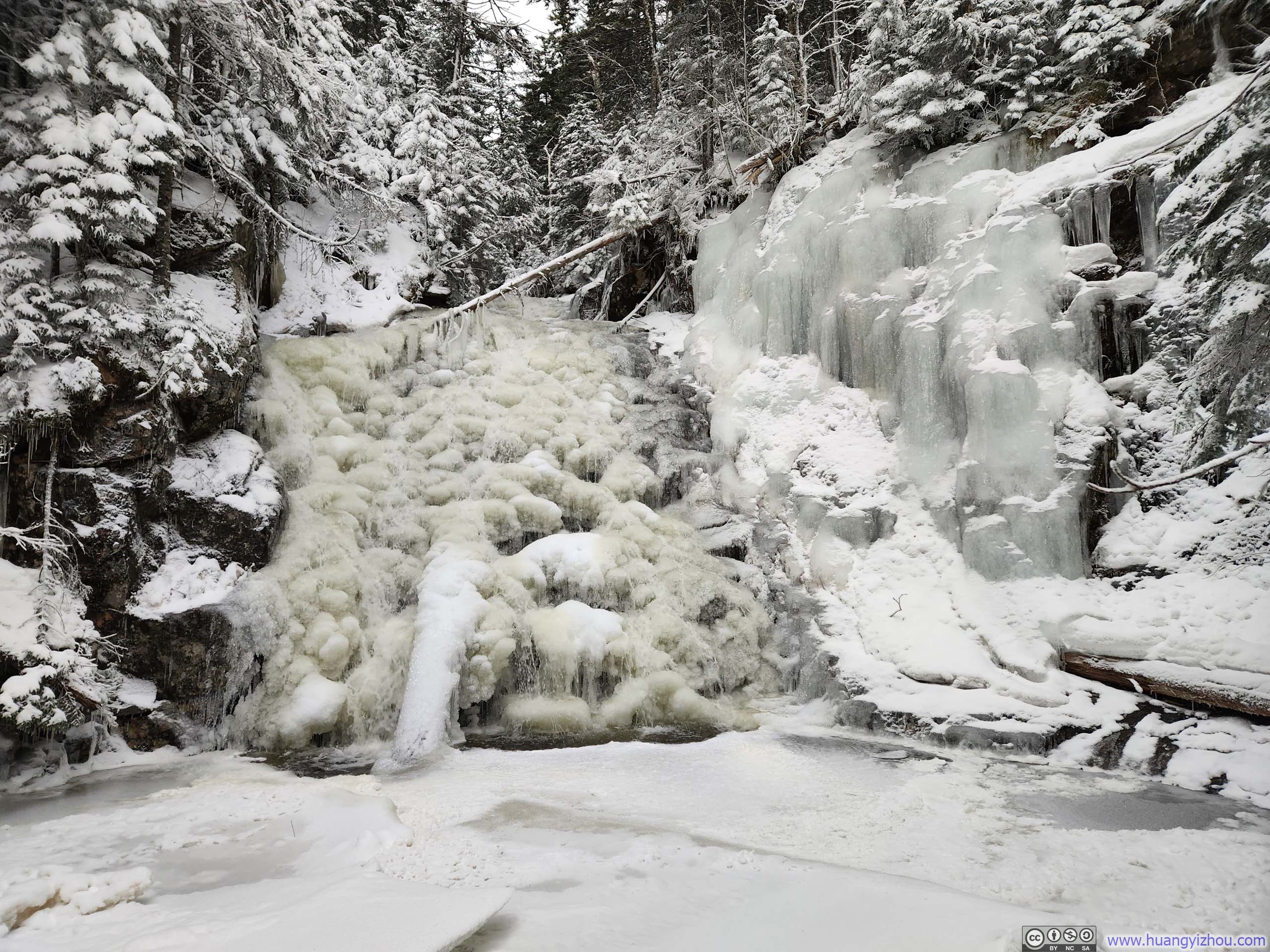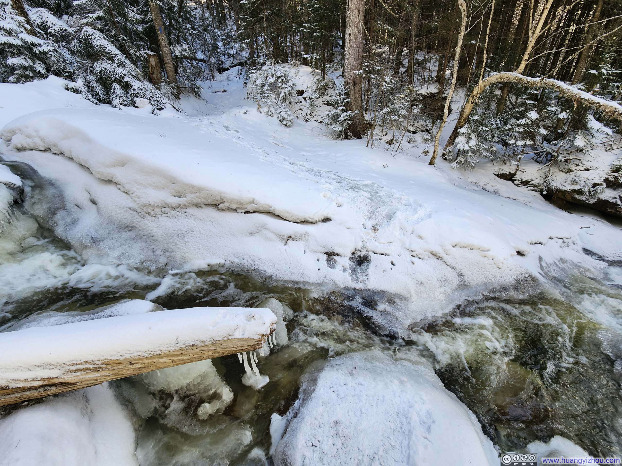 Much like the ascent, the descent wound through a winter wonderland of pristine whites. Of particular note was an impressive waterfall encountered just before the trail intersection, where the trail crossed Silver Cascade (p1 below). The falls were largely frozen over, yet one could still discern that they comprised two distinct sections, each frozen into subtly different shapes and hues. I couldn’t help but wonder whether this spoke to two separate water sources feeding the cascade.