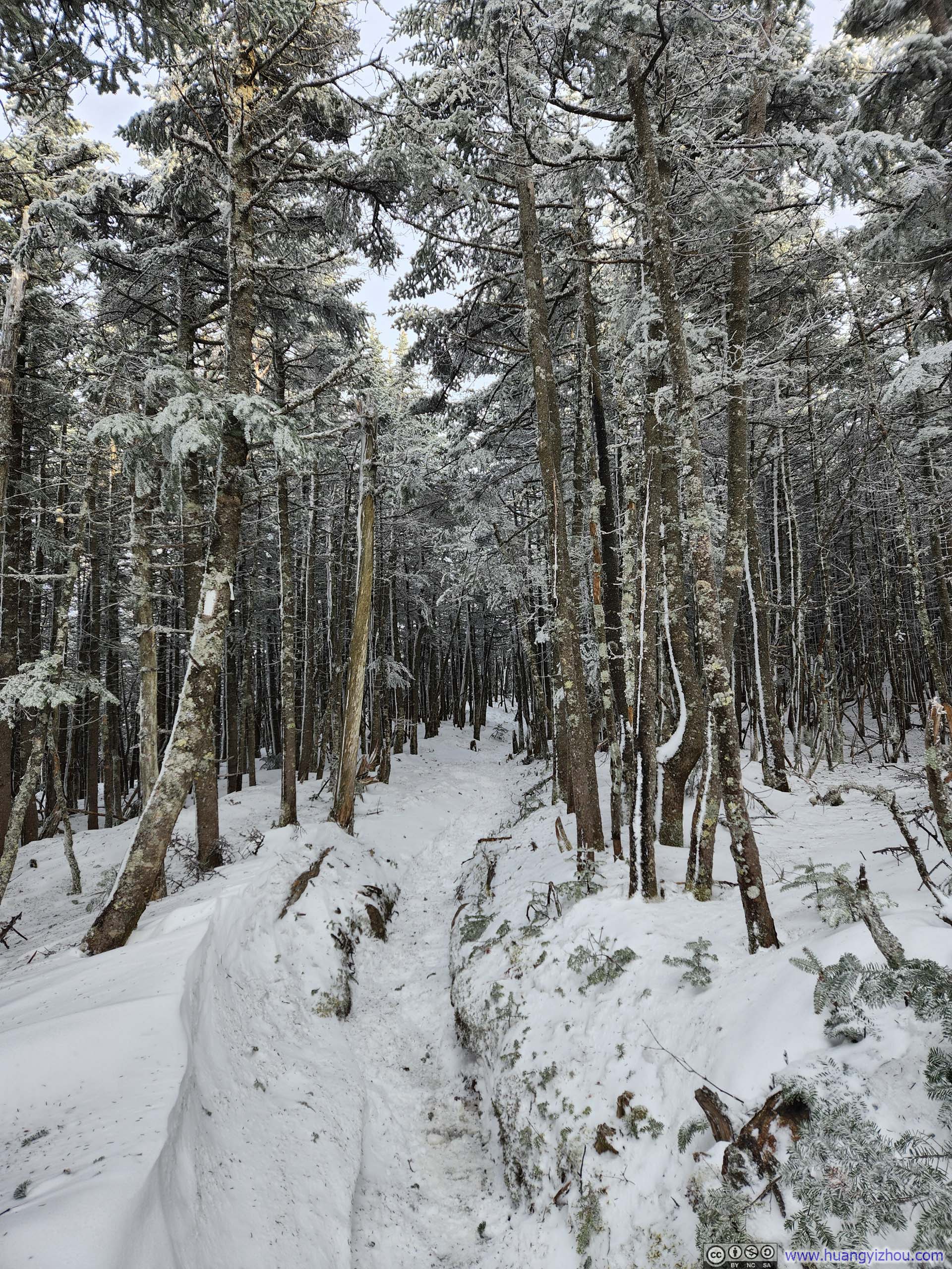 About halfway into the hike, the trail toward Mt Jackson and Mt Webster diverged into two separate branches. Prior to this intersection, the gradients were pleasantly mild; beyond it, however, the ascent grew noticeably steeper, and the snowpack visibly deeper. Strong northerly winds from the previous night’s storm had left a striking contrast of colors between the windward and leeward sides of the trees lining the trail, a subtle yet beautiful reminder of nature’s quiet drama.